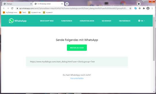 Nach der Auswahl der einzuladenden Person wird automatisch der Link verschickt. Die über WhatsApp eingeladene Person muss dann nur noch den Link ausführen, um an der Gruppen - Diskussion teilzunehmen.